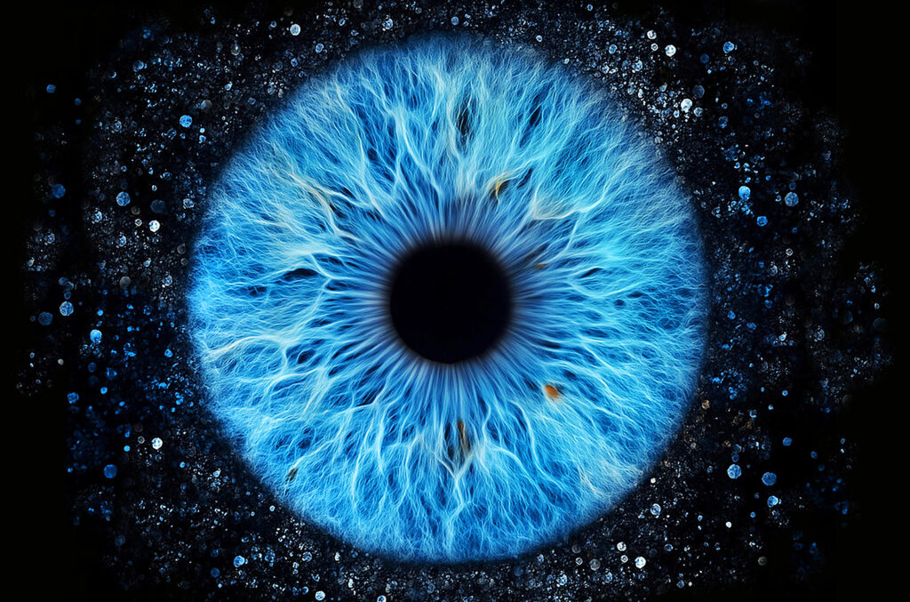 Iris fremstår som en eksplosion af tråde og fibre der strækker sig ud fra pupillen, som lysende neuronbaner. De isblå og krystalklare nuancer dominerer billedet og bærer både kulde og lys, fanget i nattehimlen.