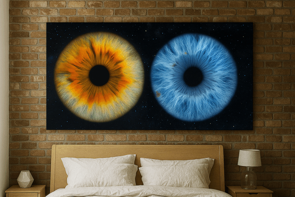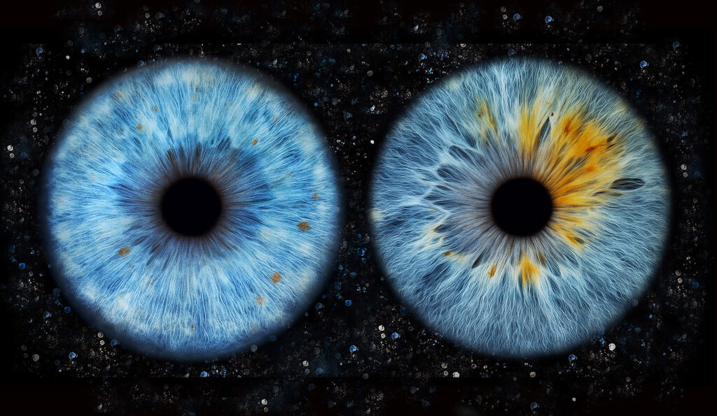 Øverst ser vi et øje i kolde, himmelblå nuancer, dækket af små jordfarvede pigmentpletter som stjerner i en klar nat. Nederst gløder en varmere iris med gyldne og ravfarvede struktur, som en solnedgang over isbjerge.